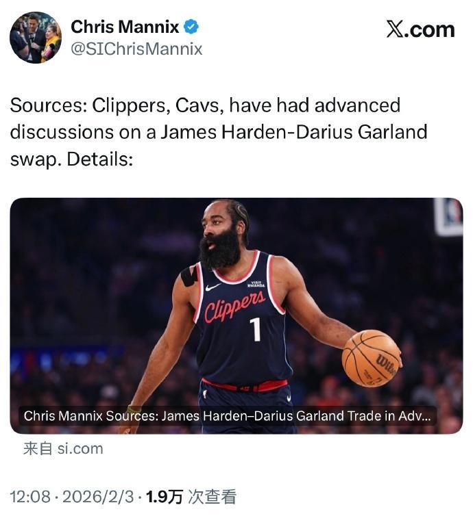 北京时间2月3日,当哈登连续两场缺席快船比赛后,如今根据《体育画报》名记Chris Mannix报道,多位消息人士透露骑士和快船已经就一项交易进行深入讨论,即讨论用哈登去交易加兰。OOS体育记者Rob Murrows跟进报道,除骑士之外,火箭也在认真考虑交易得到哈登,毕竟火箭在范乔丹受伤后急需升级后场。